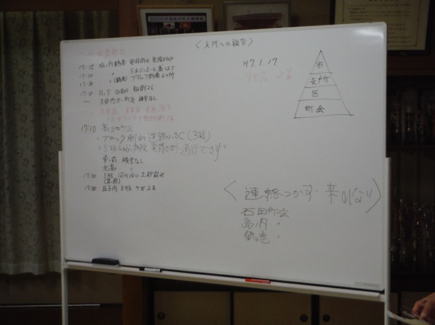 6月22日(日)に令和7年度事業計画にあります「防災研修会」は、今年度は自主防災訓練の「情報収集伝達訓練」を実施しました。地震発生後、通信規制がかかり電話が使用できなくなったという想定で、町会長は自町会の被害状況を収集して集会所に集まり、本部役員とともに報告会を開催しました。